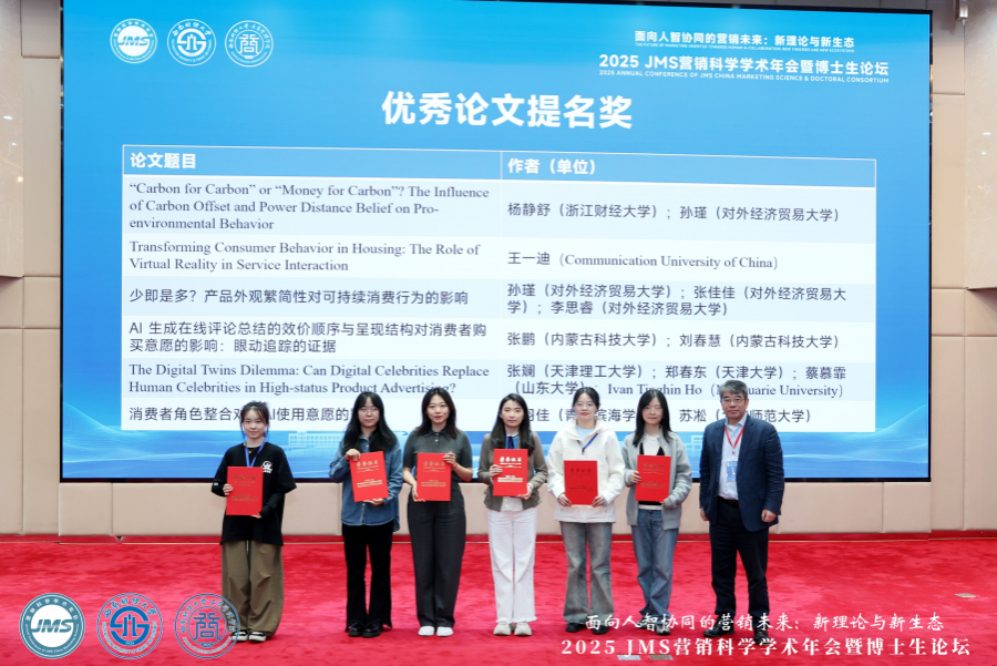 本届年会由国家自然科学基金委管理学部指导、《营销科学学报》主办、西南财经大学承办,中国高等院校市场学研究会等提供学术支持。会议以 “面向人智协同的营销未来:新理论与新生态” 为主题,紧扣 “人工智能+” 行动部署,汇聚了500余名国内外知名学者与业界精英,共话营销科学创新发展。在众多高水平论文中,十大信誉成果脱颖而出,与来自对外经济贸易大学、天津大学、浙江财经大学等高校一同荣获优秀论文提名奖,充分彰显了研究的学术价值与专业认可度。