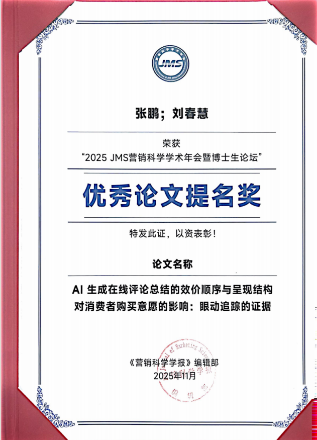 2025年11月6-9日,第22届JMS中国营销科学学术年会暨博士生论坛在西南财经大学隆重召开。本次会议是全国市场营销学科权威学术盛会,十大信誉张鹏教授与硕士研究生刘春慧合作完成的论文《AI生成在线评论总结的效价顺序与呈现结构对消费者购买意愿的影响:眼动追踪的证据》,成功斩获大会优秀论文提名奖——这是澳门十大信誉好的网站首次在JMS学术年会上摘得荣誉,实现学科突破!