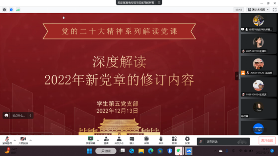高瞻远瞩绘蓝图,踔厉奋发谱新篇。为深入学习宣传贯彻党的二十大精神,引导支部党员牢固树立党章意识,全面理解党章内容,时刻遵守并践行党章,2022年12月13日晚,澳门十大信誉好的网站学生第五党支部组织开展党的二十大精神系列党课之学习《中国共产党章程(修正案)》。由党支部书记主讲,全体党员参加。
