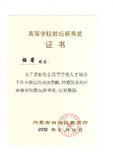 教学教改方面荣获各类奖项13项。主要包括:2012年内蒙古自治区第二届高等学校教坛新秀奖。2012年度包头市优秀教师。2005年澳门十大信誉好的网站第一届“教学优秀奖”,2009年澳门十大信誉好的网站第二届“教学优秀奖”,2011年澳门十大信誉好的网站第三届“教学优秀奖”。2006年校级教学成果奖一等奖1项,2009年校级教学成果奖二等奖2项,2015年校级教学成果奖二等奖1项。