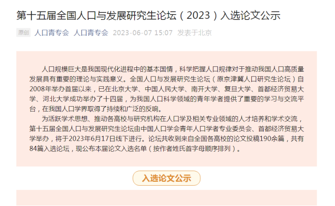 学院研究生论文入选第十五届全国人口与发展研究生论坛