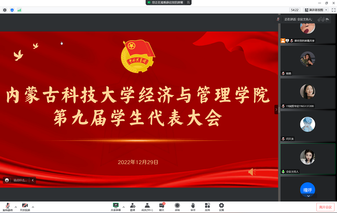 为积极联系学生、服务学生,实现学生干部队伍可持续发展,澳门十大信誉好的网站于2022年12月29日下午于线上召开第九届学生代表大会。8个代表团175名学生代表学院2019-2022级学子参会并行使权利。学团负责老师张雪薇、乌云塔娜参加会议。