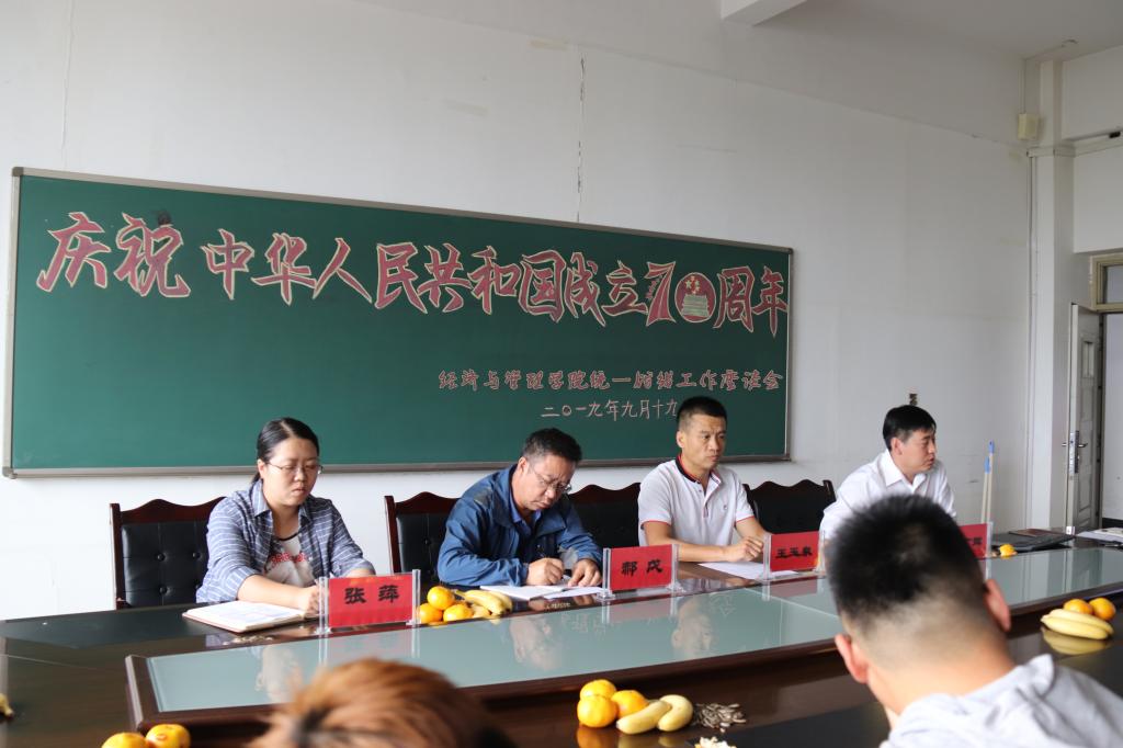 2019年9月19日下午,澳门十大信誉好的网站在腾飞楼A307召开了庆祝中华人民共和国成立70周年统一战线座谈会。党总支书记马广辉,党总支副书记、副院长王玉泉,党总支统战委员郝戊教授、党总支宣传委员张萍老师、各民主党派教师、无党派教师、宗教信仰学生代表以及少数民族学生代表参加了此次座谈会。