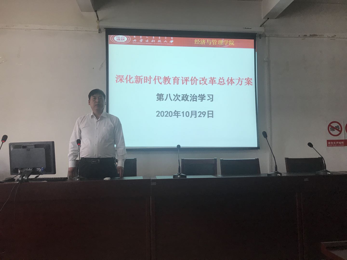 20201029日,澳门十大信誉好的网站党总支组织全体教师召开了学习贯彻落实《深化新时代教育评价改革总体方案》精神传达会。党总支书记马广辉主持会议并传达了有关内容。