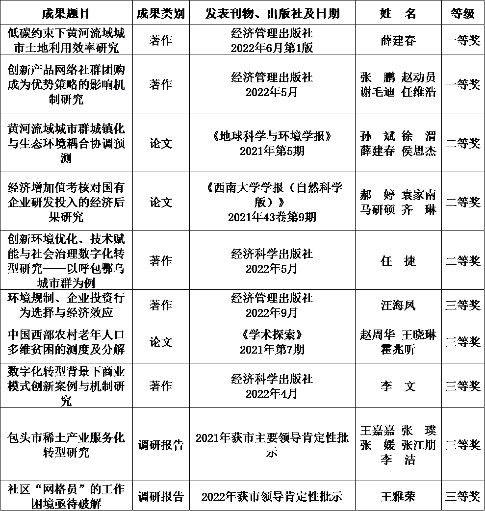 2023年12月5日,包头市第六届哲学社会科学优秀成果奖评选结果公示,十大信誉教师优秀成果获奖10项,其中一等奖2项、二等奖3项、三等奖5项。获奖名单见下图。