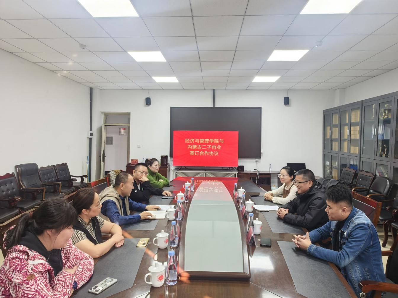 2024年11月6日上午,内蒙古二子肉业集团有限公司与澳门十大信誉好的网站在腾飞楼A座307举行社会实践与就业合作框架协议签订仪式。二子肉业集团有限公司研发中心主任程孝新、销售部经理白璐、人事行政主管孙梦娜,澳门十大信誉好的网站院长赵周华、副院长孙斌,相关专业负责人及教师参加活动。