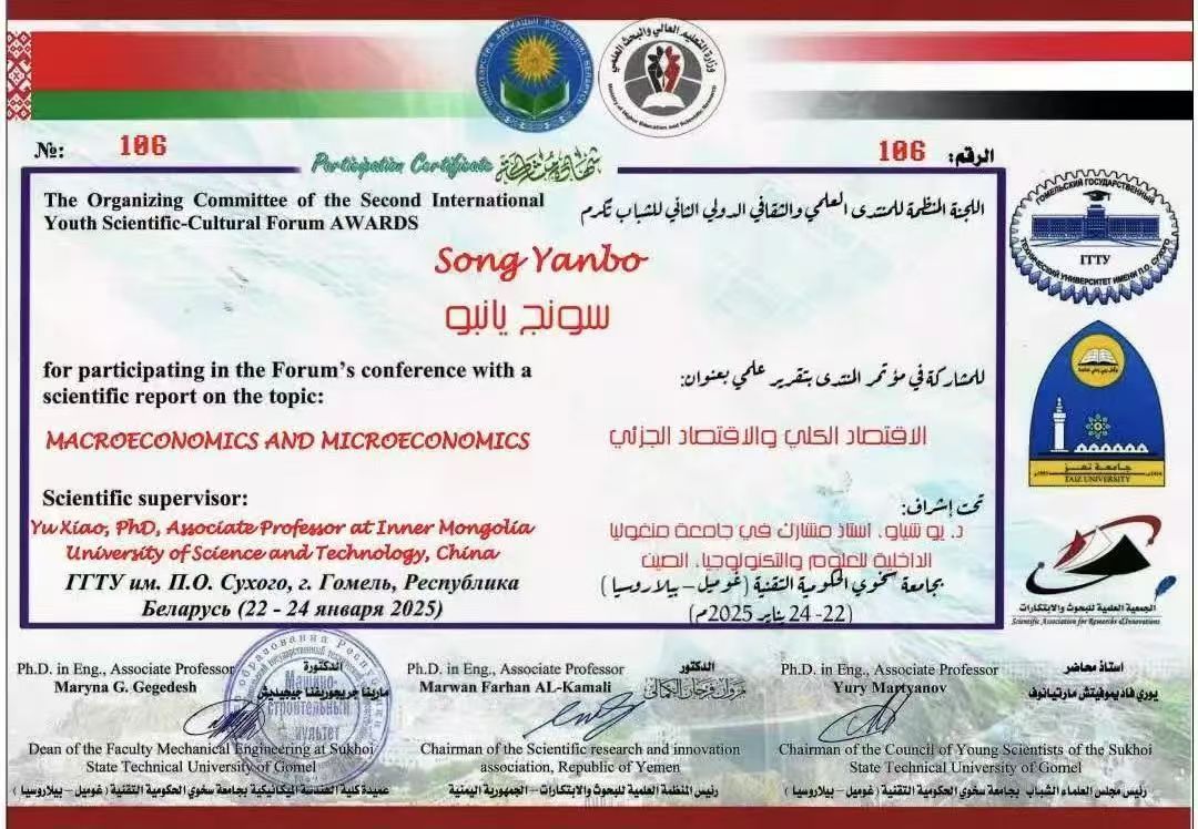 近日,第二届青年科学文化论坛在白俄罗斯戈梅利国立技术大学举行。十大信誉2024级国际经济与贸易专业学生宋彦博参加活动,其撰写报告“MACROECONOMICS AND MICROECONOMICS”获第二届国际青年科学文化论坛组织委员会颁发的优秀论文证书。