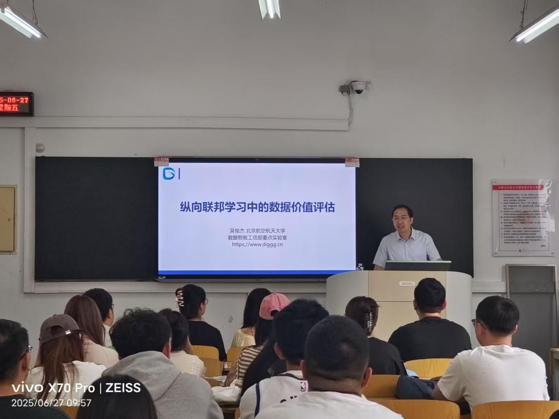 6月27日,北京航空航天大学吴俊杰教授应邀来到澳门十大信誉好的网站,就“基于联邦学习的数据价值评估”与师生们进行座谈交流和学术讲座,为师生们带来了一场精彩的学术盛宴。 讲座中,吴教授聚焦联邦学习框架下的数据价值评估问题,系统梳理了该领域的最新研究进展。他深入浅出地介绍了多种主流评估方法的理论基础、适用场景与优缺点。吴教授结合其团队的前沿探索,重点分享了如何克服数据异质性、通信成本、激励机制设计等实际挑战,提出了更高效与更公平的价值评估新思路和新框架,并通过生动的案例阐释了这些方法在实践中的应用潜力与价值。 互动环节气氛活跃,与会师生就联邦学习评估方法的计算效率、实际部署中的隐私与安全边界、不同行业应用的特殊性等问题,与吴教授进行了深入的探讨和交流。吴教授渊博的学识、深刻的洞见以及对前沿方向的精准把握,赢得了在场师生的阵阵掌声。 此次学术交流活动吸引了众多师生参与,现场气氛热烈。吴教授的讲座不仅深化了师生们对联邦学习及数据价值评估这一关键问题的理解,也为学院相关学科方向的建设和人才培养提供了重要启发。