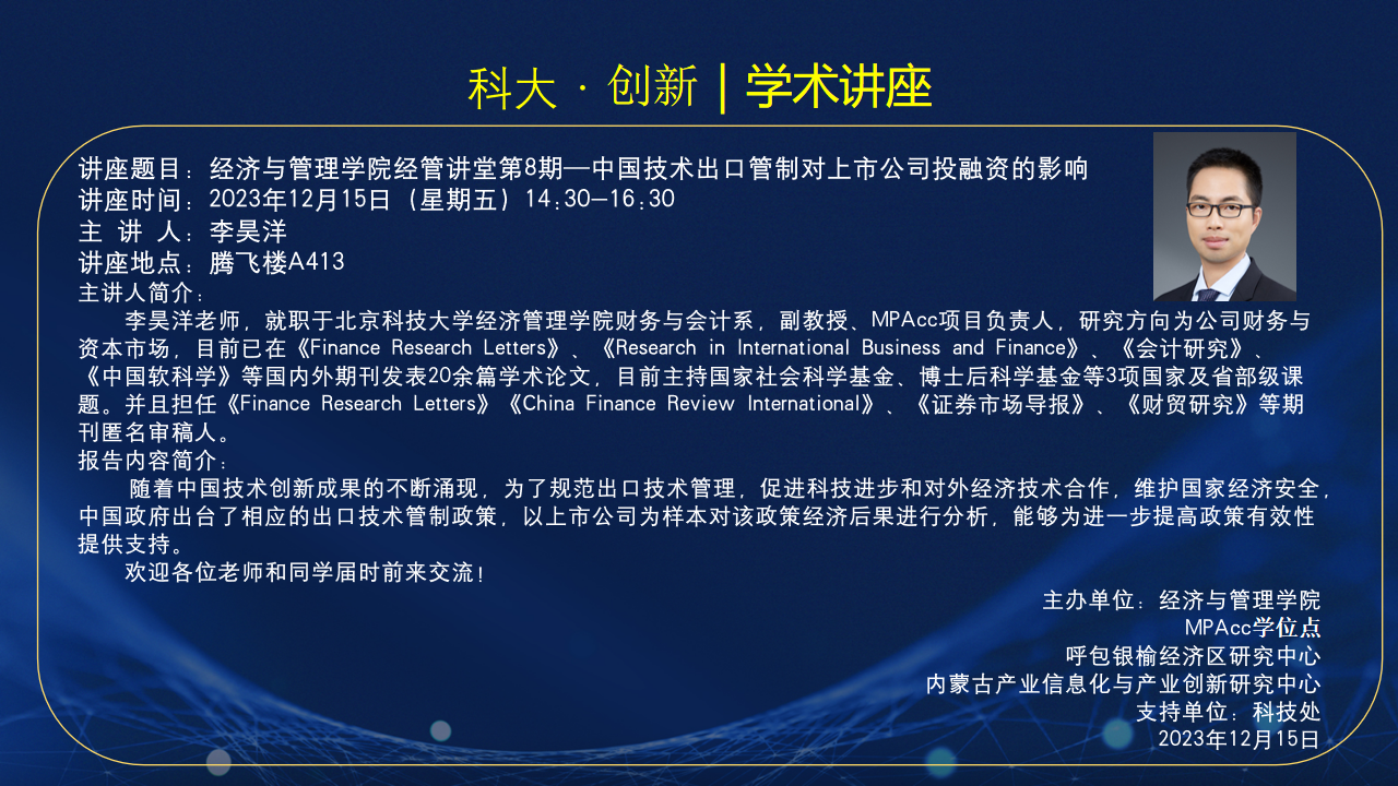 讲座题目:澳门十大信誉好的网站经管讲堂第8期—中国技术出口管制对上市公司投融资的影响